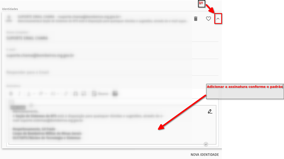 Ao abrir a tela de edição, ir  no campo de Identidades e clicar a seta para abrir as opções, assim clicar no campo de edição e inserir a assinatura.&#x20;